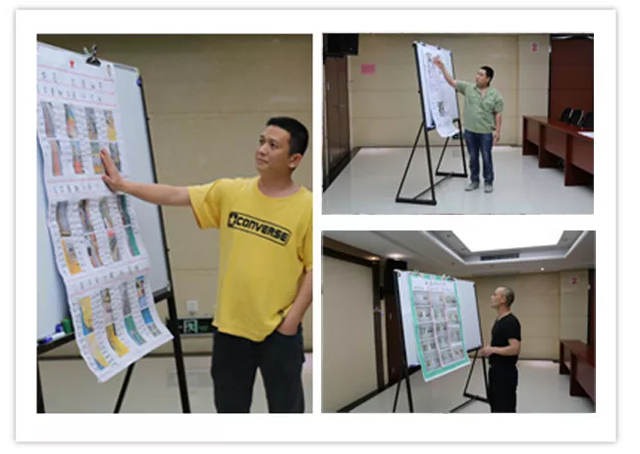 總結會上,輔導老師挑選了優秀的海報,讓制作人給大家進行了經驗分享,同時指出了現階段我司精益生產取得的成績以及存在的不足。