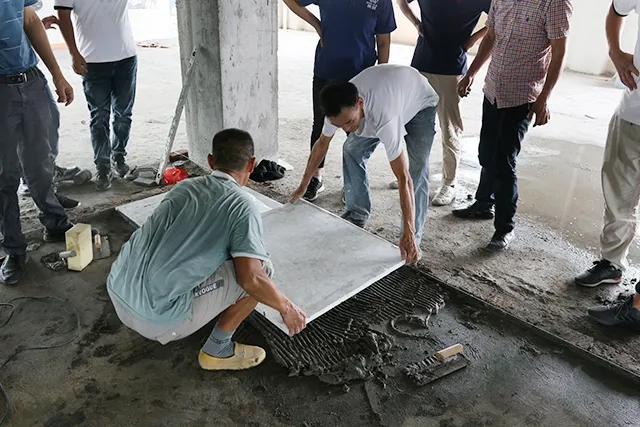 為了加深榮冠銷(xiāo)售團(tuán)隊(duì)對(duì)無(wú)機(jī)石產(chǎn)品施工方面的理解,公司在當(dāng)日下午特別組織了一場(chǎng)無(wú)機(jī)石產(chǎn)品鋪貼施工演示。全體人員都認(rèn)真觀看了整個(gè)流程,對(duì)施工過(guò)程中遇到的問(wèn)題積極提問(wèn),取得了很好的效果。