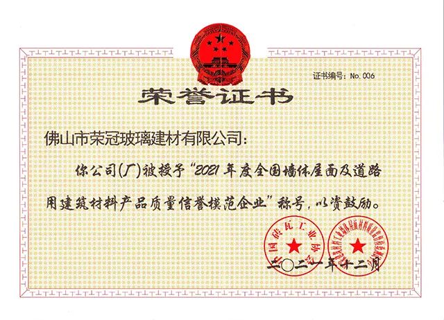 為促進行業技術創新、節能減排、減污降碳及質量提升,樹立標桿效應和品牌效應。會上,對佛山市榮冠玻璃建材有限公司等82家企業授予了“2021年度全國墻體屋面及道路用建筑材料產品質量信譽模范企業”稱號。這是榮冠公司連續4年獲得該項榮譽。
